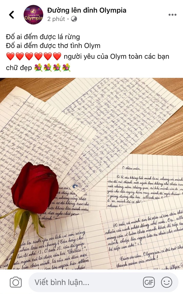Mới đây vào ngày 19/2, Fanpage đã chính thức đăng bức ảnh chụp rất nhiều lá thư của khán giả mến mộ cũng như các thí sinh từng dự chương trình với dòng caption ấn tượng: " Đố ai đếm được lá rừng/ Đố ai đếm được thơ tình Olym/ N gười yêu của Olym toàn các bạn chữ đẹp."